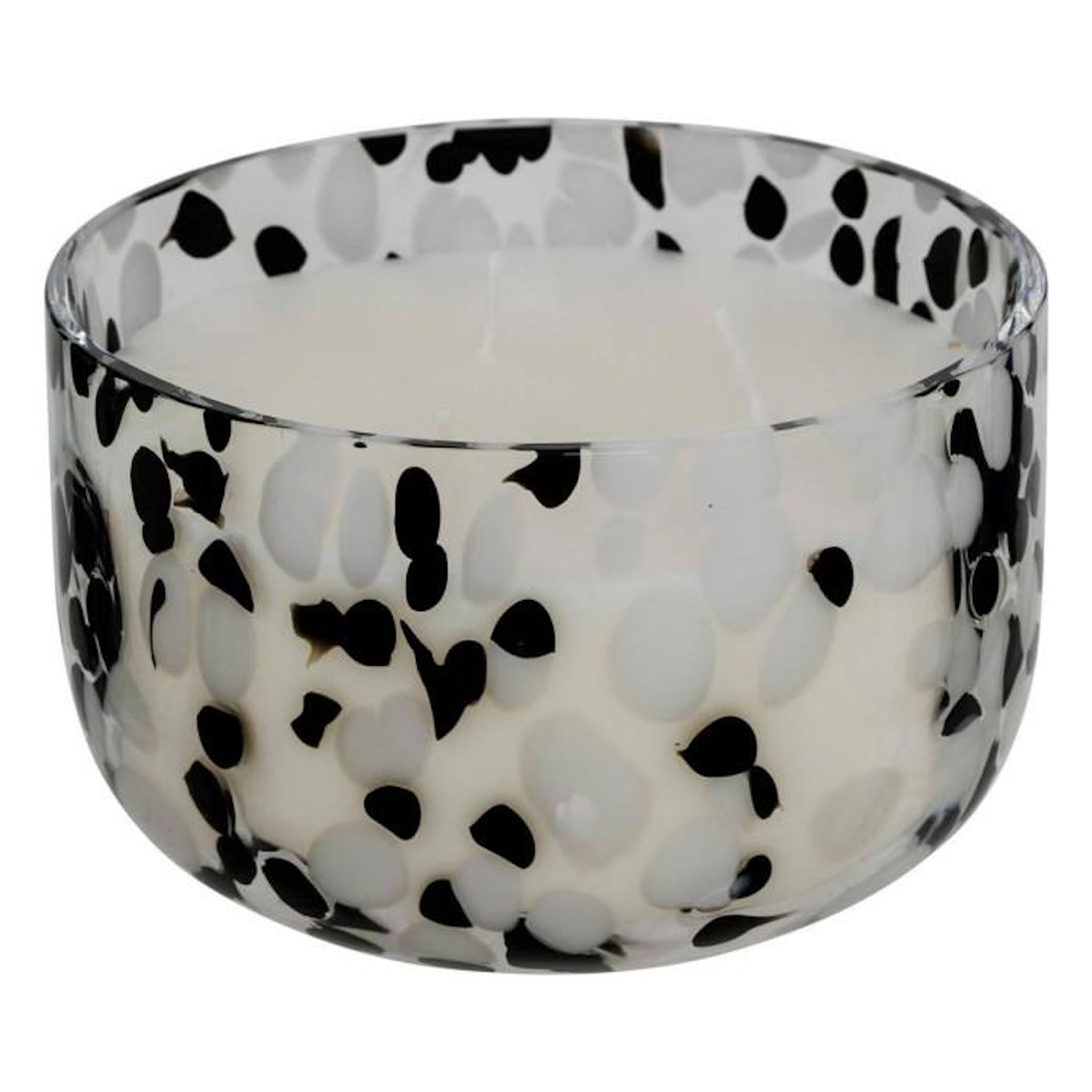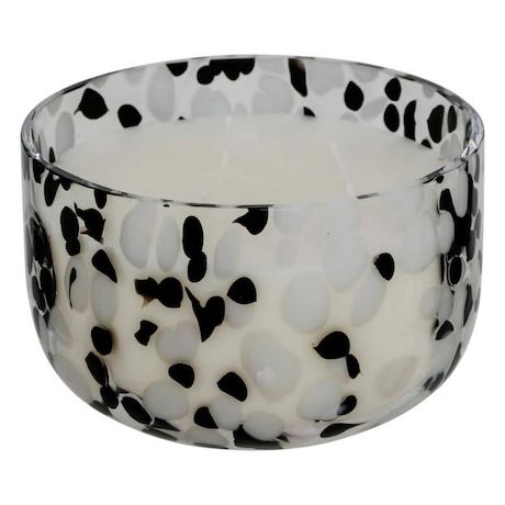 Informations Techniques : Dimensions : D. 13 x H. 8 cm Matières : Verre, Paraffine & Cire de Palme Spécificités : Déco & Moderne Bougie parfumée ronde Imprimé tacheté bicolore Parfum : Ambre Durée de combustion : 35 heures Contenance : 540 g Poids : 1 kg Couleur : Noir & Blanc