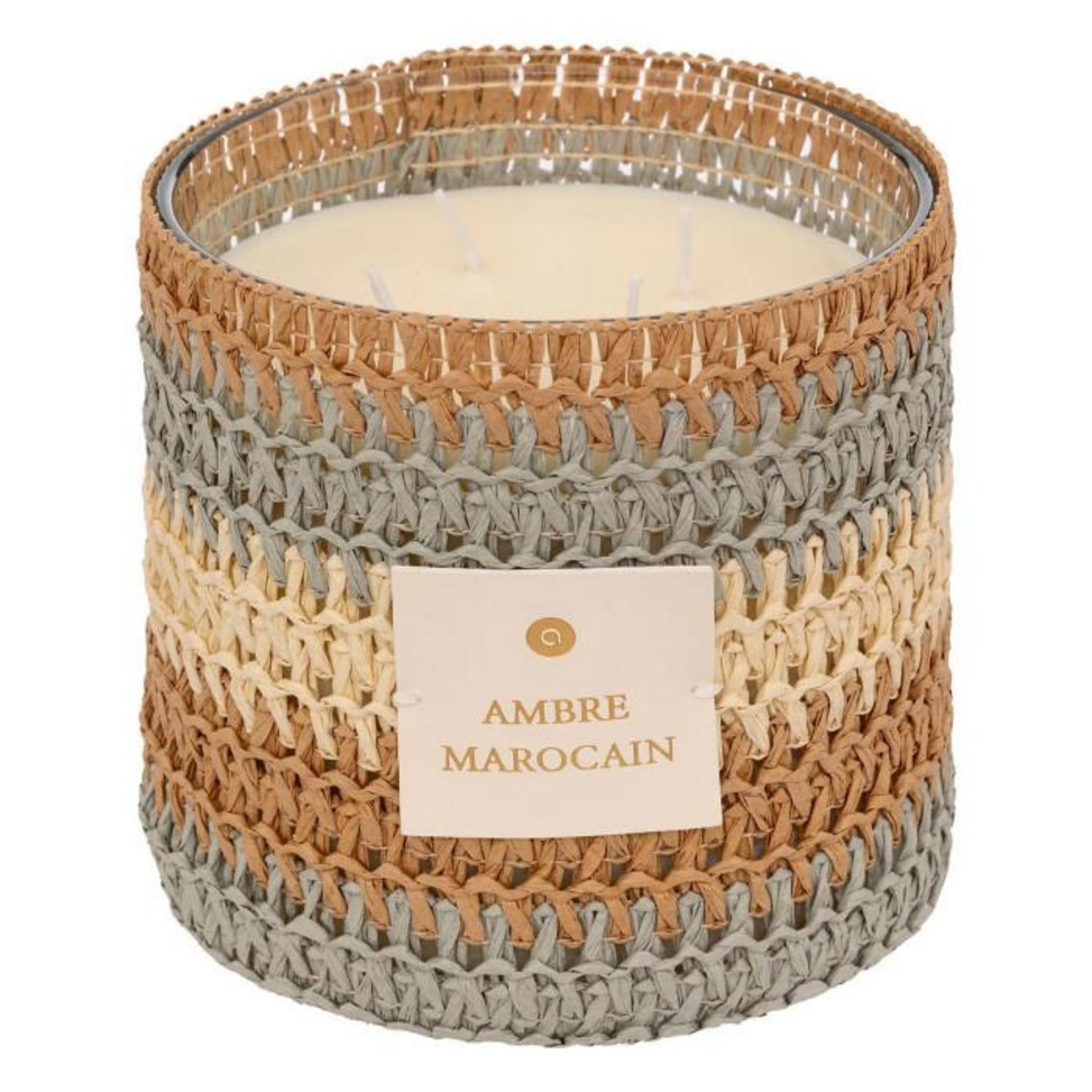 Informations Techniques :@Informations Techniques : Dimensions : D. 15,4 x H. 15,7 cm Matières : Verre & Paraffine Spécificités : Déco & Tendance Bougie parfumée 4 mèches Design tissé coloré Senteur : Ambre marocain Durée de combustion : 85 heures Capacité : 1400 g Poids : 2,7 kg Couleur : Multicolo