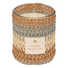Informations Techniques : Dimensions : D. 10,5 x H. 13 cm Matières : Verre & Paraffine Spécificités : Déco & Tendance Bougie parfumée 2 mèches Design tissé coloré Senteur : Ambre marocain Durée de combustion : 65 heures Capacité : 470 g Poids : 1 kg Couleur : Multicolore