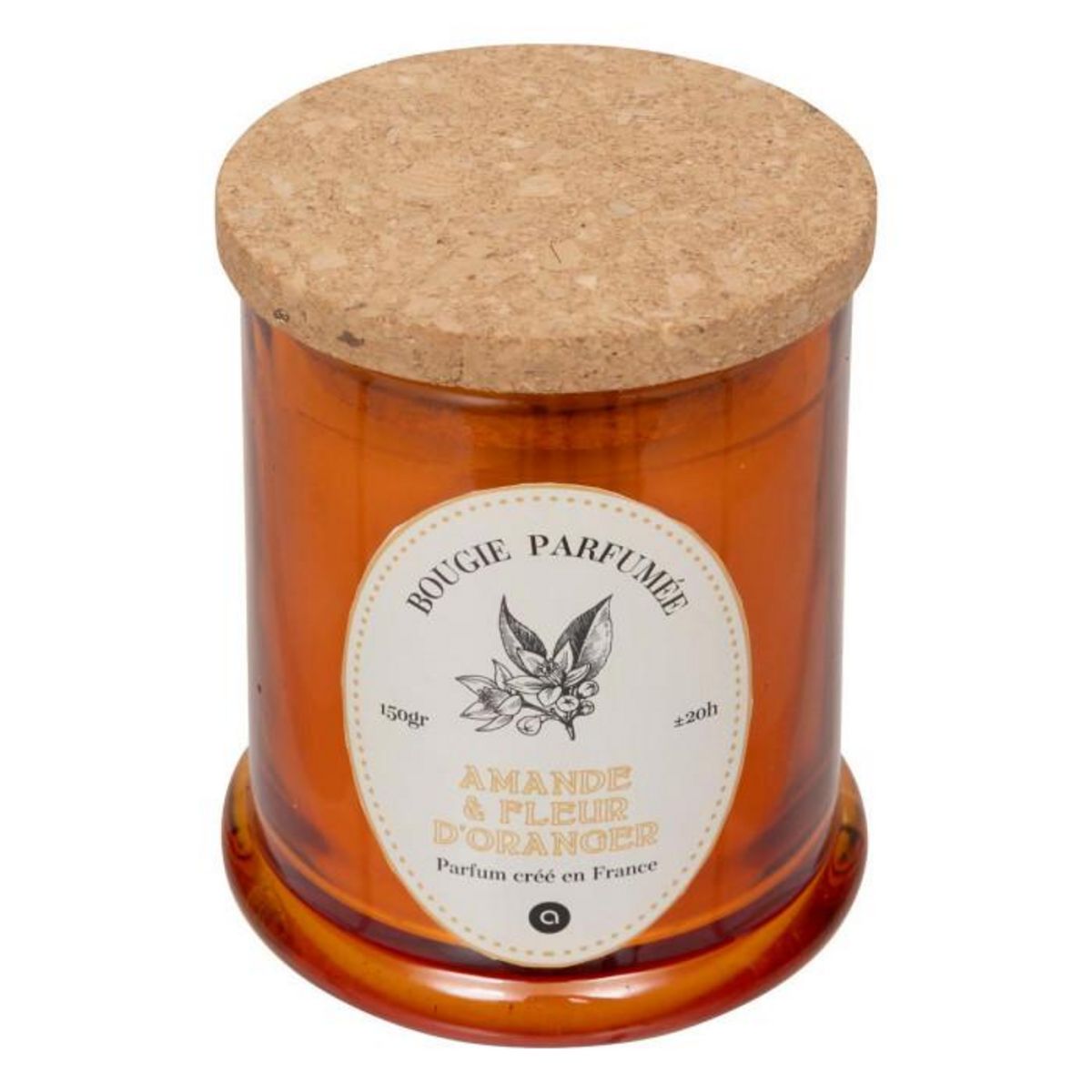 Informations Techniques : Dimensions : D. 7,6 x H. 10,2 cm Matières : Paraffine, Verre & Liège Spécificités : Utile & Vintage Bougie parfumée déco Avec couvercle en liège Parfum créé en France Senteurs : Amande et fleur d'oranger Contenance : 150 g Durée de combustion : +/- 20 heures Poids : 0,44 kg