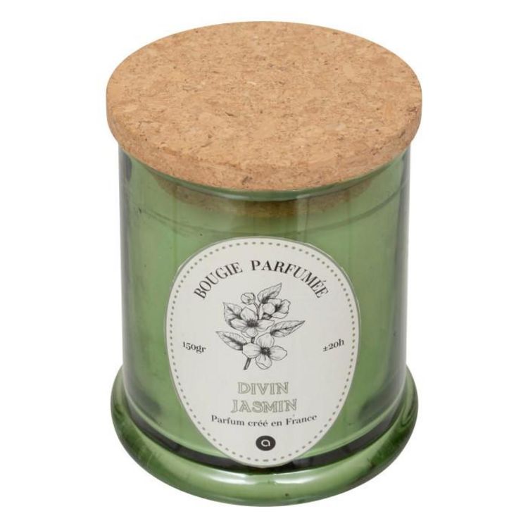Informations Techniques : Dimensions : D. 7,6 x H. 10,2 cm Matières : Paraffine, Verre & Liège Spécificités : Utile & Vintage Bougie parfumée déco Avec couvercle en liège Parfum créé en France Senteur : Divin jasmin Contenance : 150 g Durée de combustion : +/- 20 heures Poids : 0,44 kg Couleur : Ver