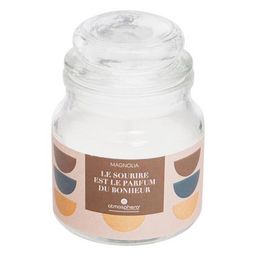 Informations Techniques : Dimensions : D. 6,2 x H. 8,7 cm Matières : Verre & Cire Spécificités : Pratique & Utile Bougie Parfumée Forme Ronde Senteur : Magnolia Inscription Le Sourire est le Parfum du Bonheur % de Parfum : 3% Durée de Combustion : 12 heures Contenance : 70 g Poids : 0,225 kg Coule