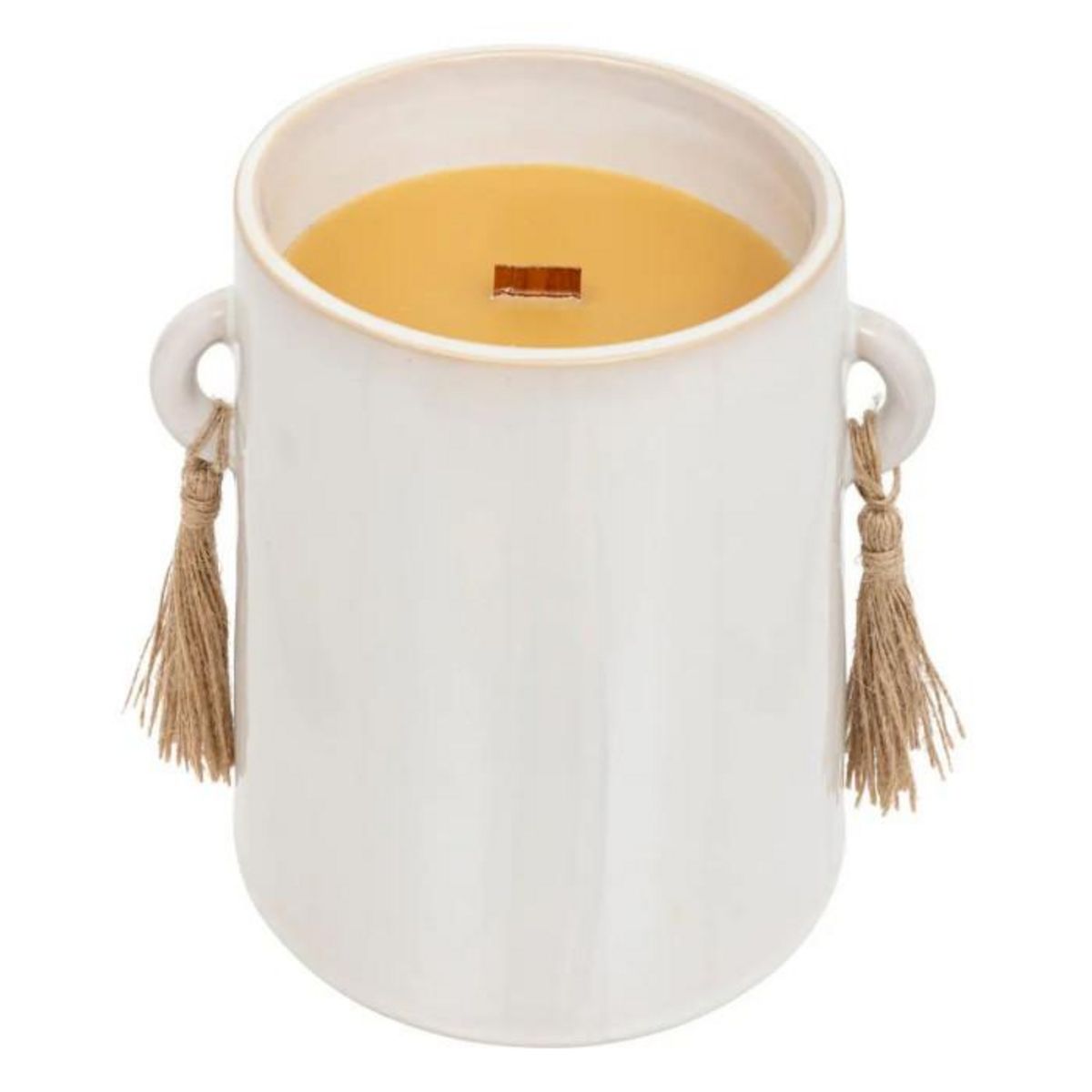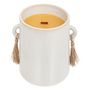 Informations Techniques : Dimensions : L. 15,3 x l. 12,5 x H. 16 cm Matières : Grès, Raphia & Paraffine Spécificités : Déco & Utile Bougie parfumée ronde Avec 1 mèche en bois Senteur : Bois de oud Contenance : 1000 g Durée de combustion : +/- 120 heures Poids : 1,78 kg Couleur : Blanc