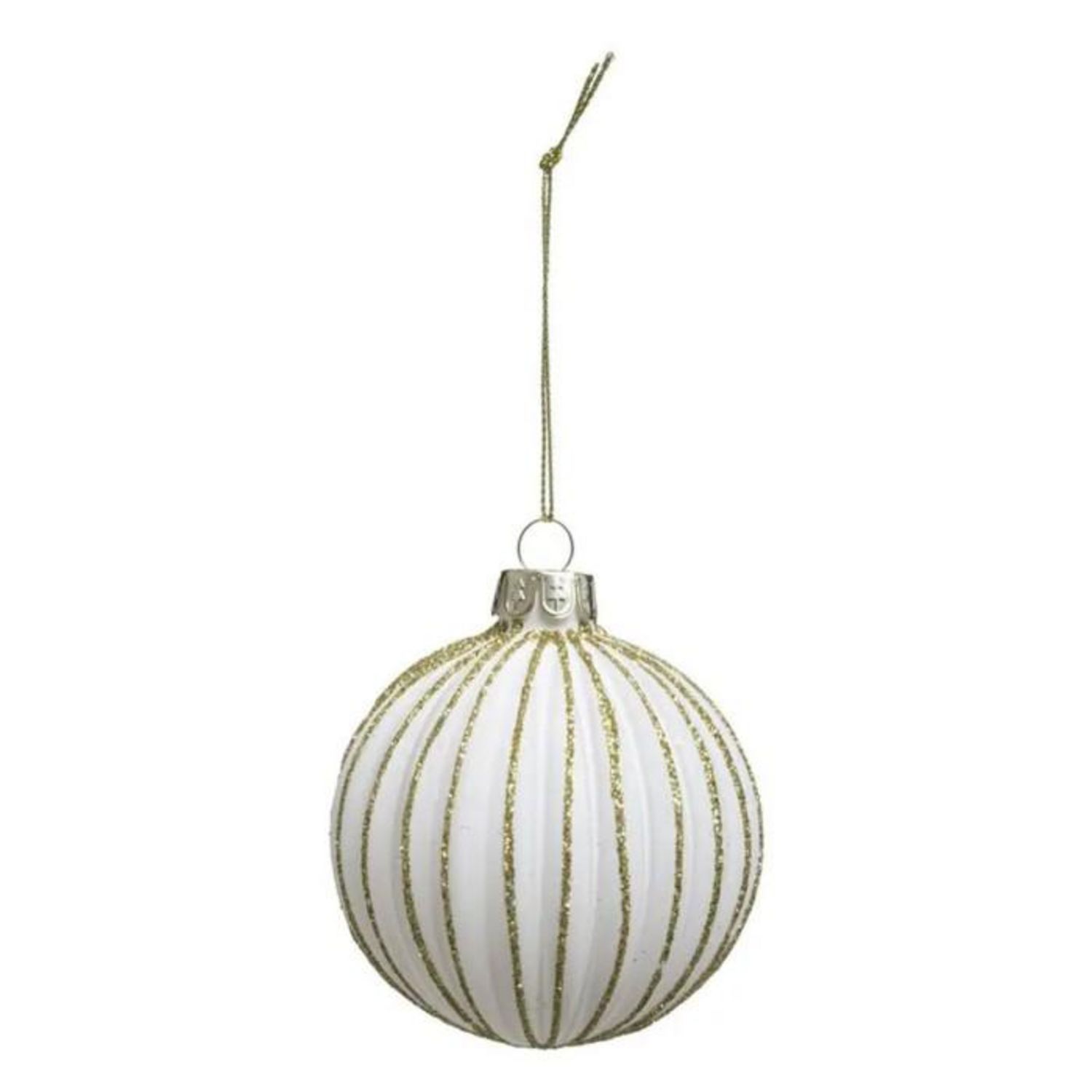 Informations Techniques : Dimensions : D. 7 cm Matière : Verre Spécificités : Pratique & Utile Boule de Noël A Suspendre Forme Ronde Effet Strié Avec Paillettes Poids : 0,02 kg Couleur : Blanc & Or