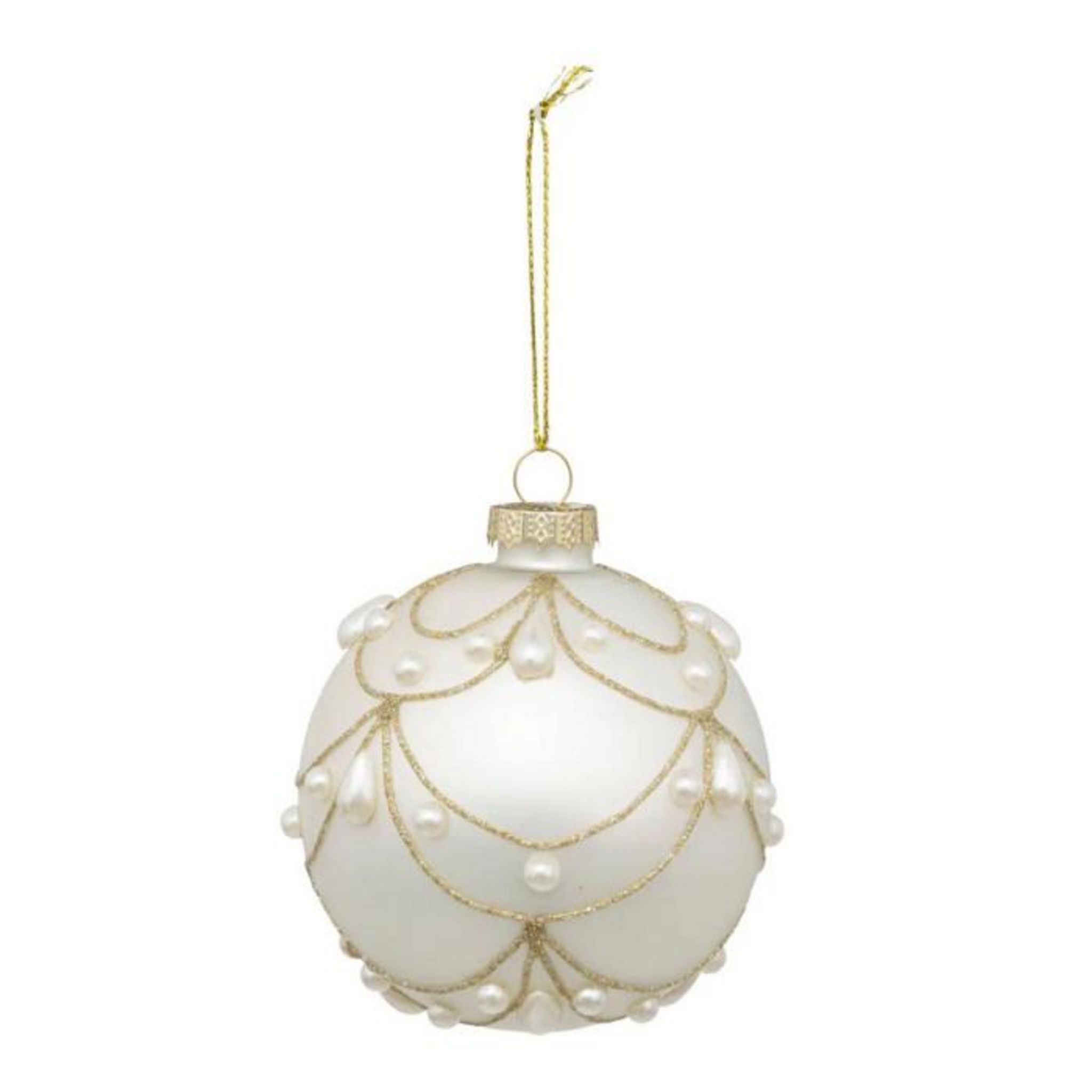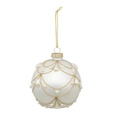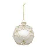 Informations Techniques : Dimensions : D. 8 cm Matière : Verre Spécificités : Pratique & Déco Boule de Noël Design perles et drapé Forme ronde Poids : 0,02 kg Couleur : Blanc