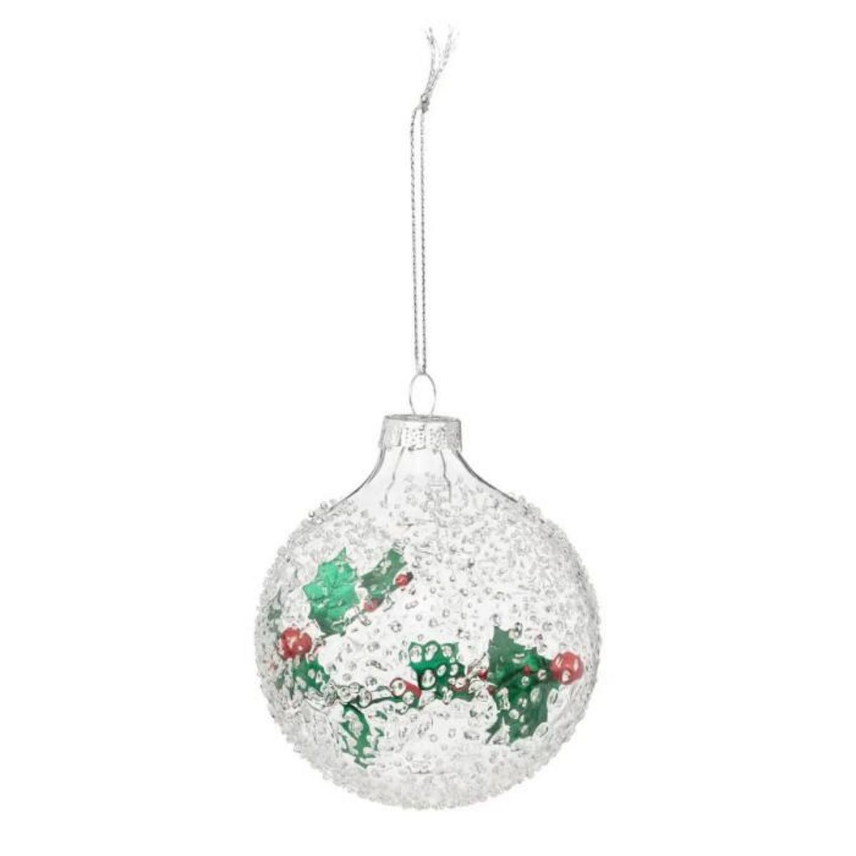 Informations Techniques : Dimensions : D. 8 cm Matière : Verre Spécificités : Pratique & Déco Boule de Noël transparente Surface non lisse Avec sujets houx Poids : 0,02 kg Couleur : Transparent