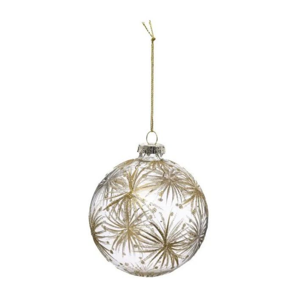 Informations Techniques : Dimensions : D. 9 cm Matière : Verre Spécificités : Pratique & Utile Boule de Noël Forme Ronde Design Fleurs Poids : 0,034 kg Couleur : Or & Transparent
