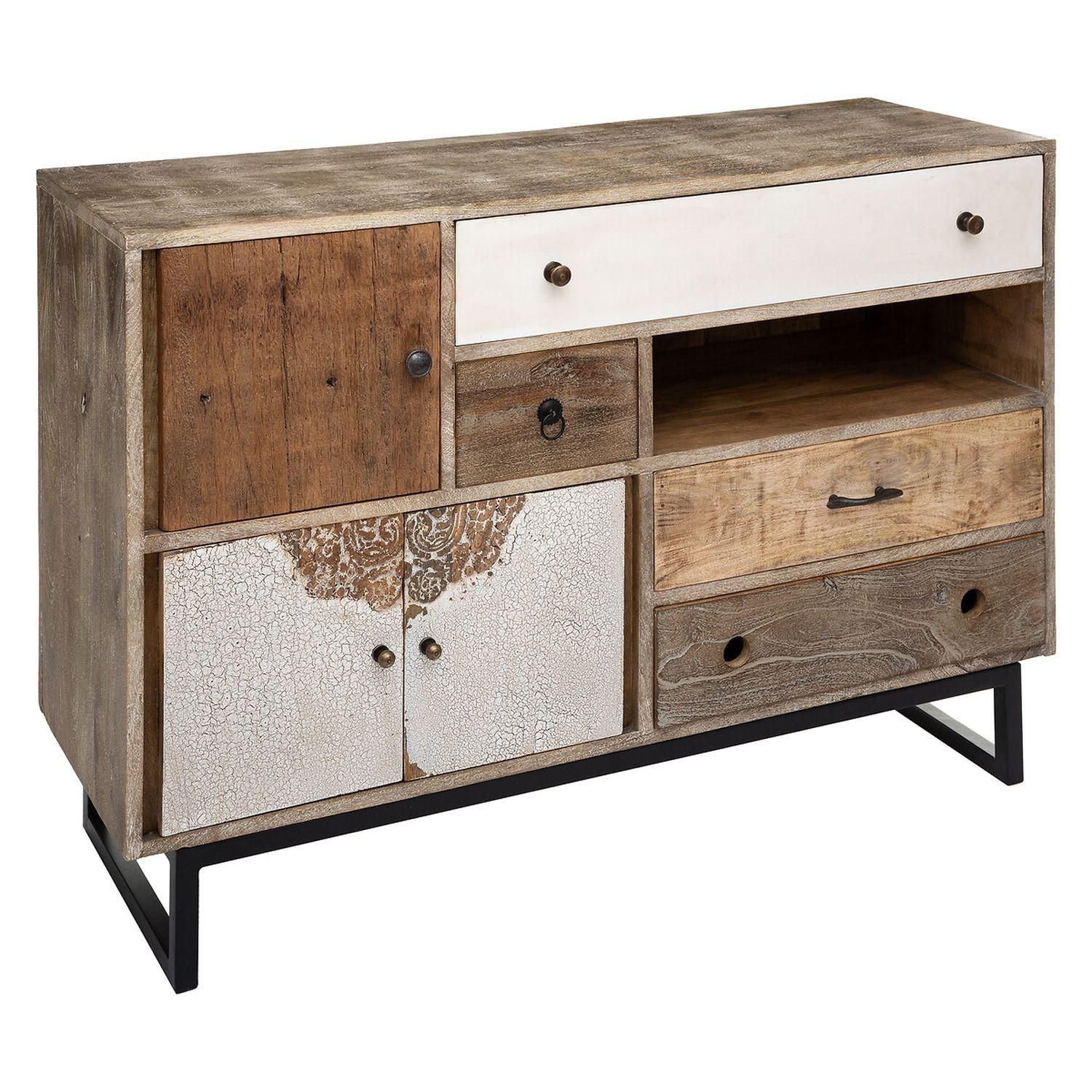 De design rustique, ce buffet apportera une touche rétro à la décoration de votre séjour. Pratiques et esthétiques, ses trois portes et ses quatre tiroirs vous offriront des rangements discrets alors que sa niche de rangement ouverte vous permettra d'exposer vos objets de déco. Sa structure en bois de manguier contraste joliment avec ses détails de façades.
