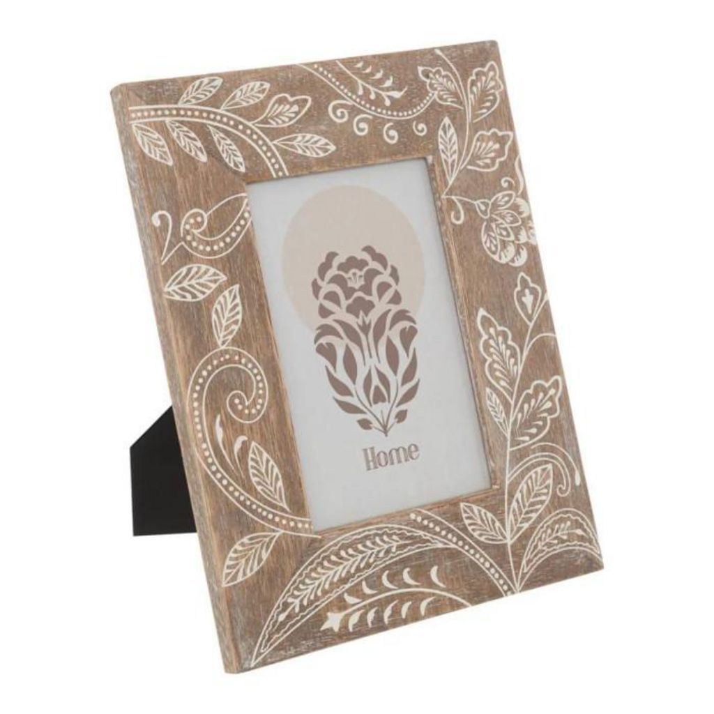 Informations Techniques : Dimensions : L. 18 x l. 1,5 x H. 23 cm Matières : Latex, MDF & Verre Spécificités : Pratique & Utile Cadre photo déco Imprimé fleuri A poser Convient pour une photo 10x15 cm Forme rectangulaire Poids : 0,26 kg Couleur : Marron