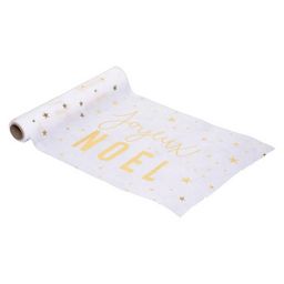 Informations Techniques : Dimensions : L. 500 x l. 28 x H. 0,2 cm Matière : Polyester Spécificités : Pratique & Utile Chemin de Table Forme Rectangulaire Inscription Joyeux Noël GSM : 35 Poids : 0,053 kg Couleur : Blanc & Or