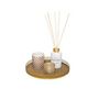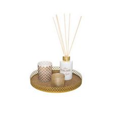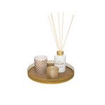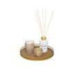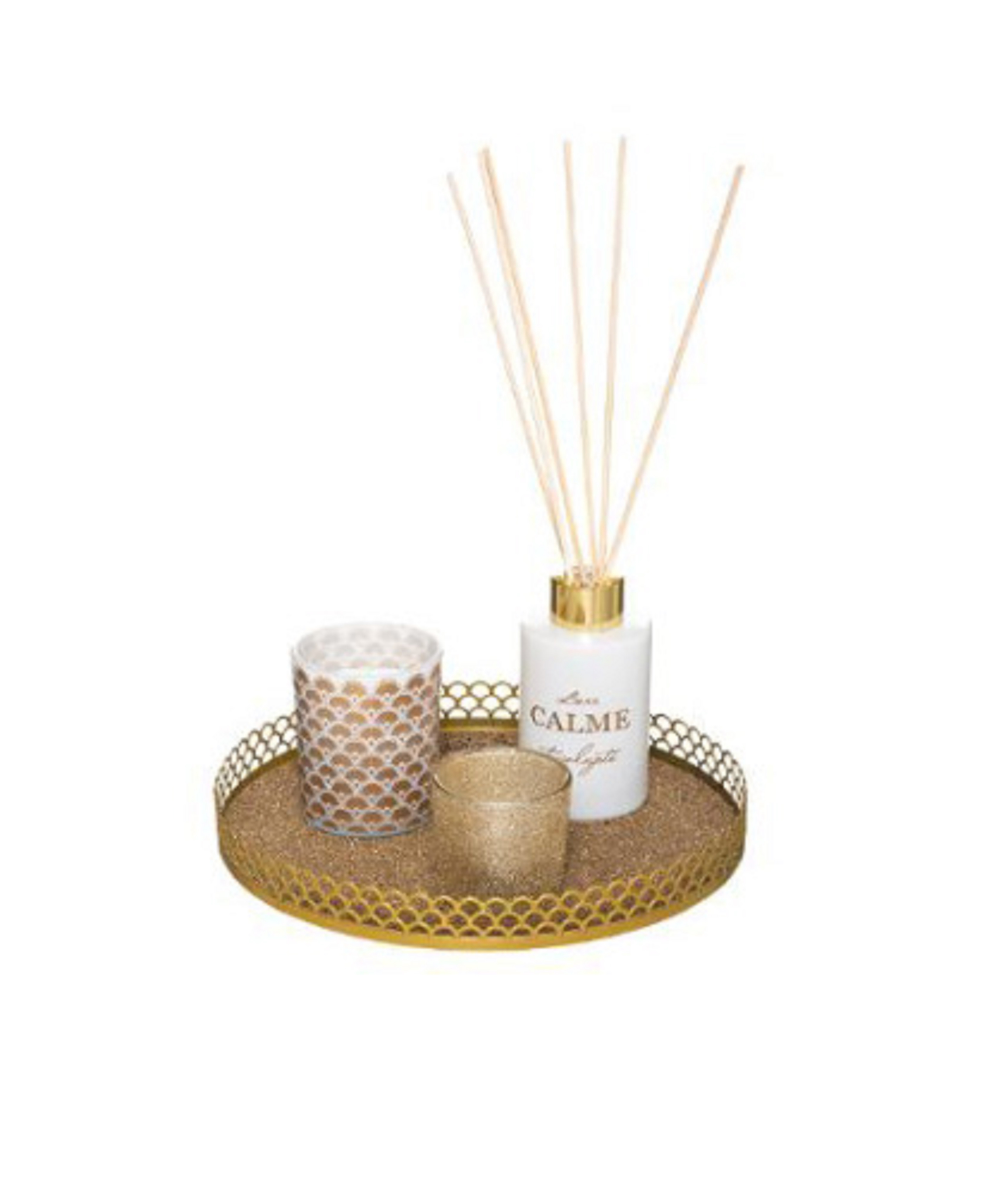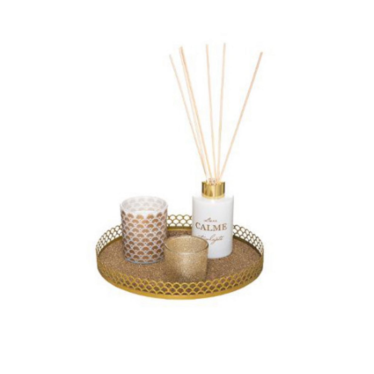 Ce coffret comprend : un plateau en métal doré, un Diffuseur de parfum et 6 bâtonnets,une Bougie dans un pot en verre et un Photophore