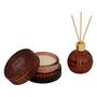 Informations Techniques : Dimensions : D. 8,1 x H. 4,9 cm Matières : Paraffine, Huile Parfumée & Verre Spécificités : Déco & Élégant Coffret senteur 2 pièces Contenants en verre Bâtonnets en rotin Parfum crée en France Contient : 1 x diffuseur de parfum 1 x bougie parfumée Senteur : Figue noire Duré
