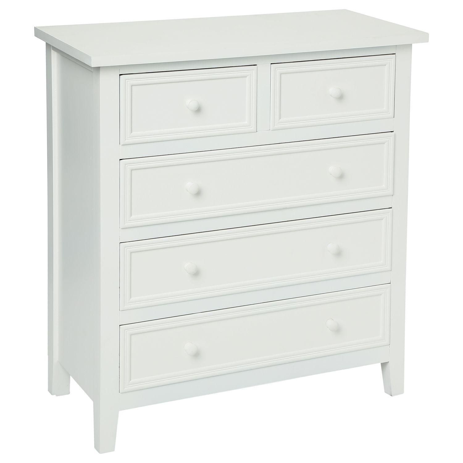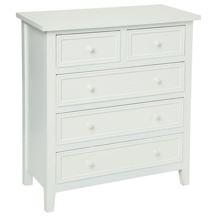Apportez à votre pièce un petit air romantique avec cette commode aussi bien pratique qu'esthétique. Ses cinq tiroirs accueilleront et organiseront vos vêtements avec élégance et style.