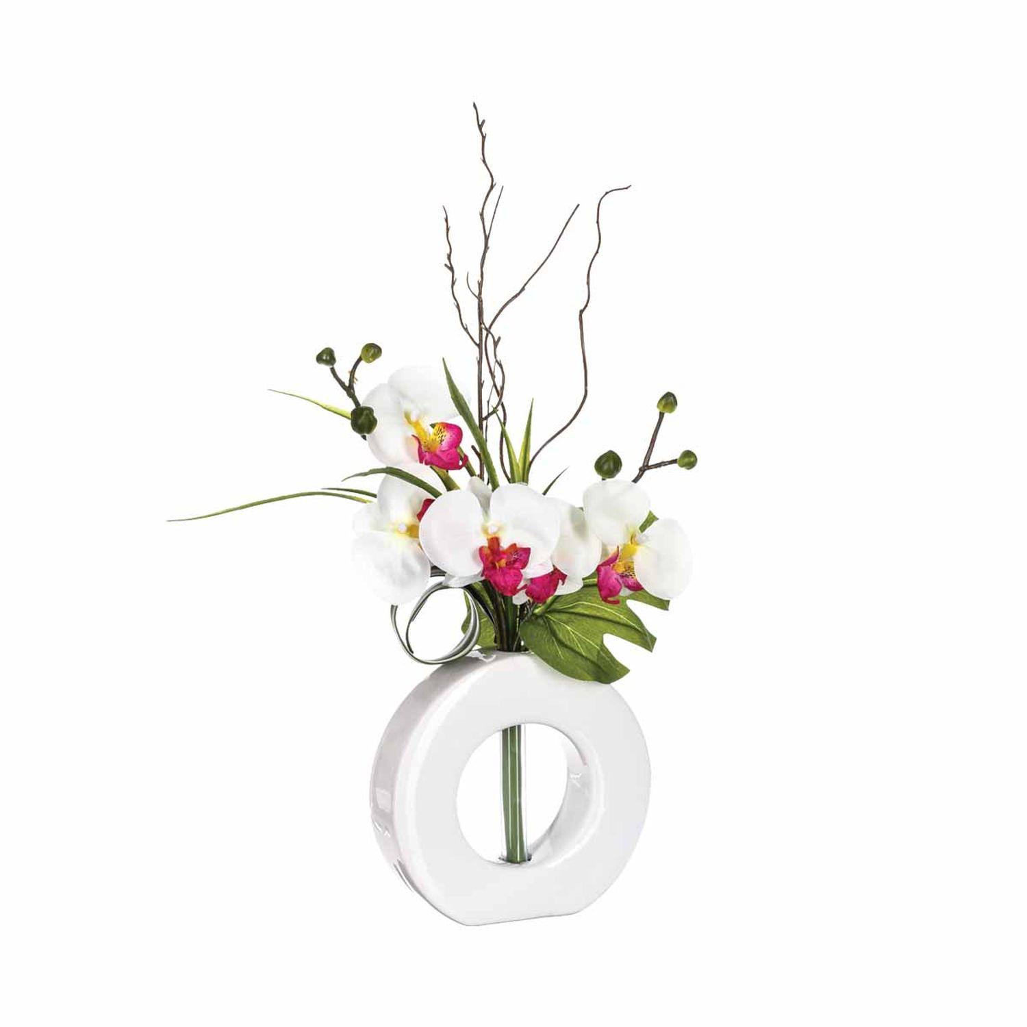 Composition florale vase blanc - Hauteur 44 cm - Orchidée fleur rose