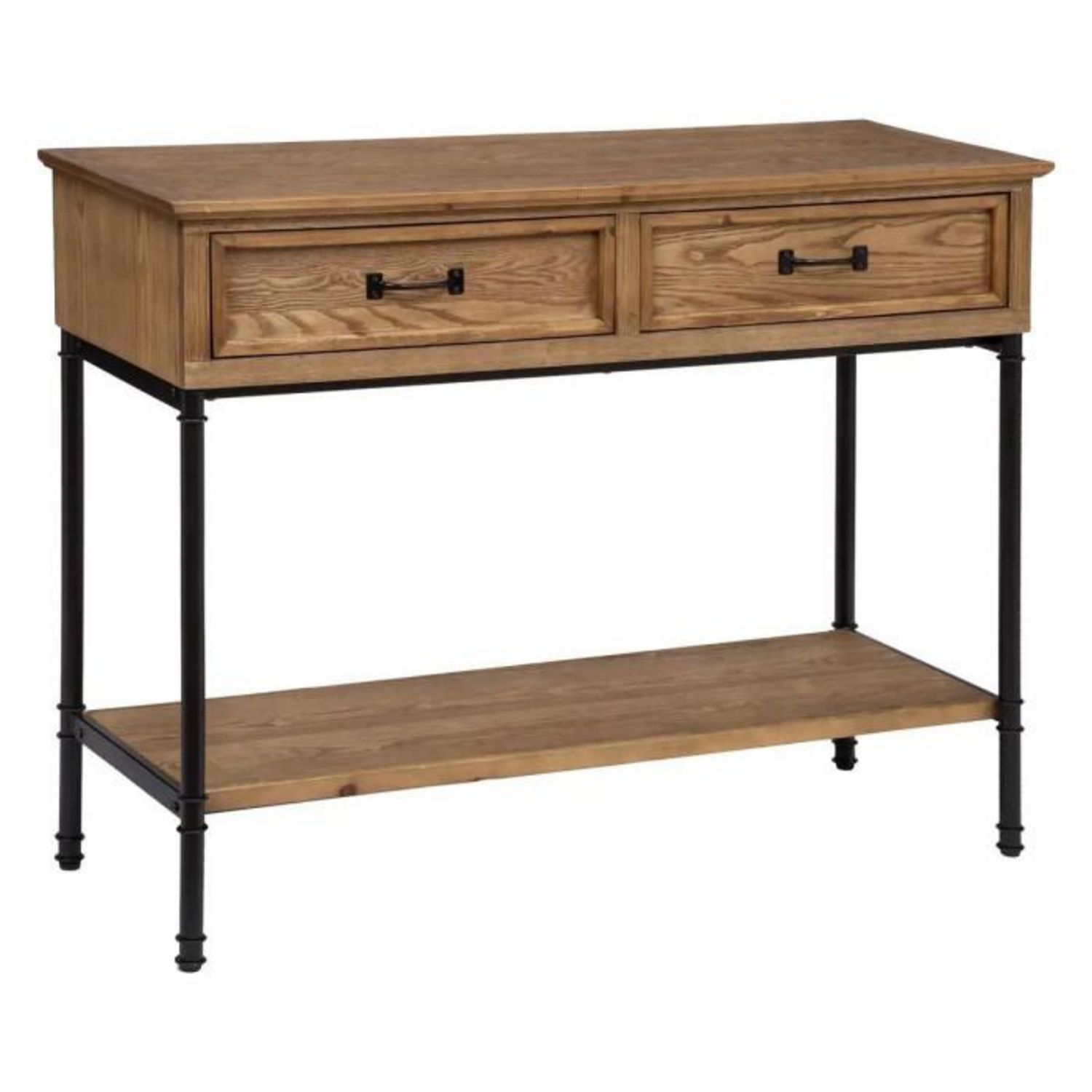 Informations Techniques : Dimensions : L. 110 x l. 40 x H. 85 cm Hauteur entre Étagères : 43 cm Tiroirs : L. 48,5 x l. 30 x H. 13 cm Matières : MDF, Fer & Bois (Sapin) Spécificités : Tendance & Moderne Console Design 2 Tiroirs A monter soi-même Poids : 17 kg Couleur : Naturel