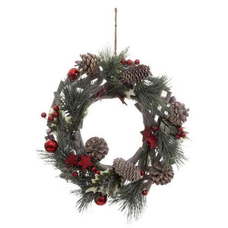 Informations Techniques : Dimensions : D. 32 x H. 8 cm Matière : Bois Spécificités : Pratique & Utile Couronne de Noël Forme Ronde A Suspendre Design Pommes de Pin & Branches Poids : 0,48 kg Couleur : Vert, Naturel & Rouge