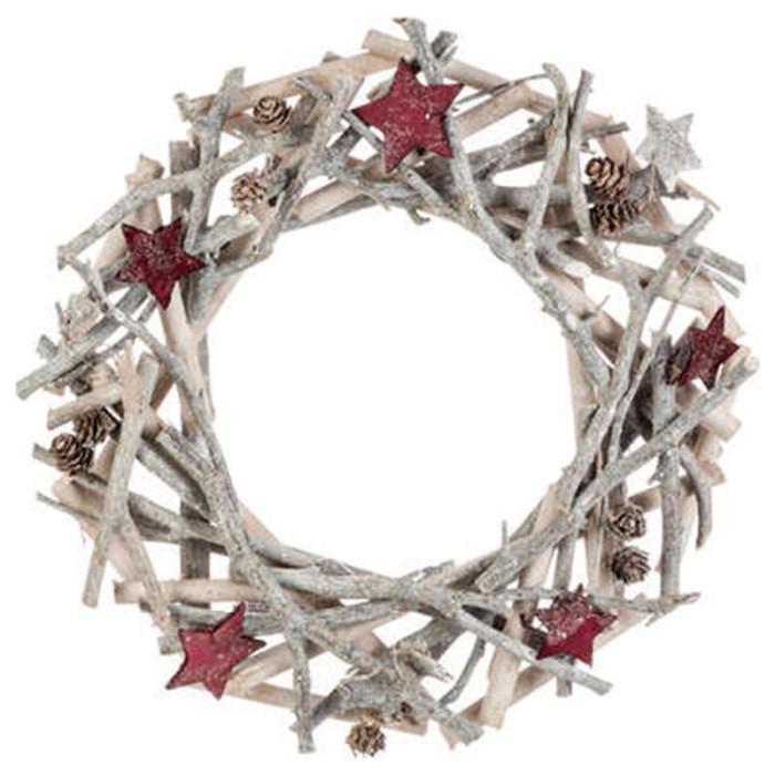 Informations Techniques : Dimensions : D. 32 cm Matière : Bois Spécificités : Pratique & Utile Couronne de Noël Forme Ronde Design Branches & Étoiles Poids : 0,43 kg Couleur : Gris & Rouge