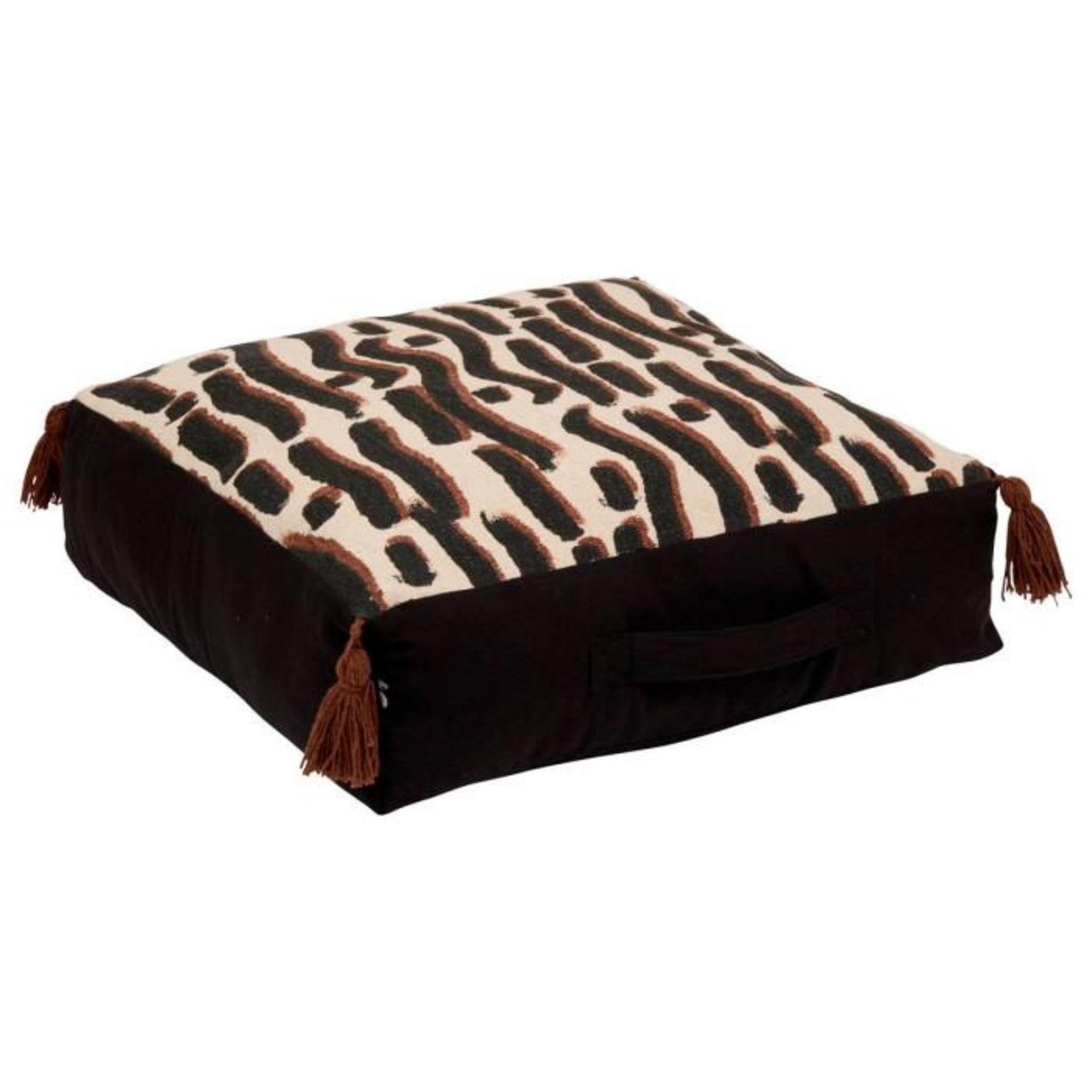 Informations Techniques : Dimensions : L. 48 x l. 48 x H. 14 cm Matière : 100% Coton Spécificités : Pratique & Confort Coussin de sol carré Motifs imprimés Avec pompons Généreusement rembourré Poids : 1,96 kg Couleur : Noir