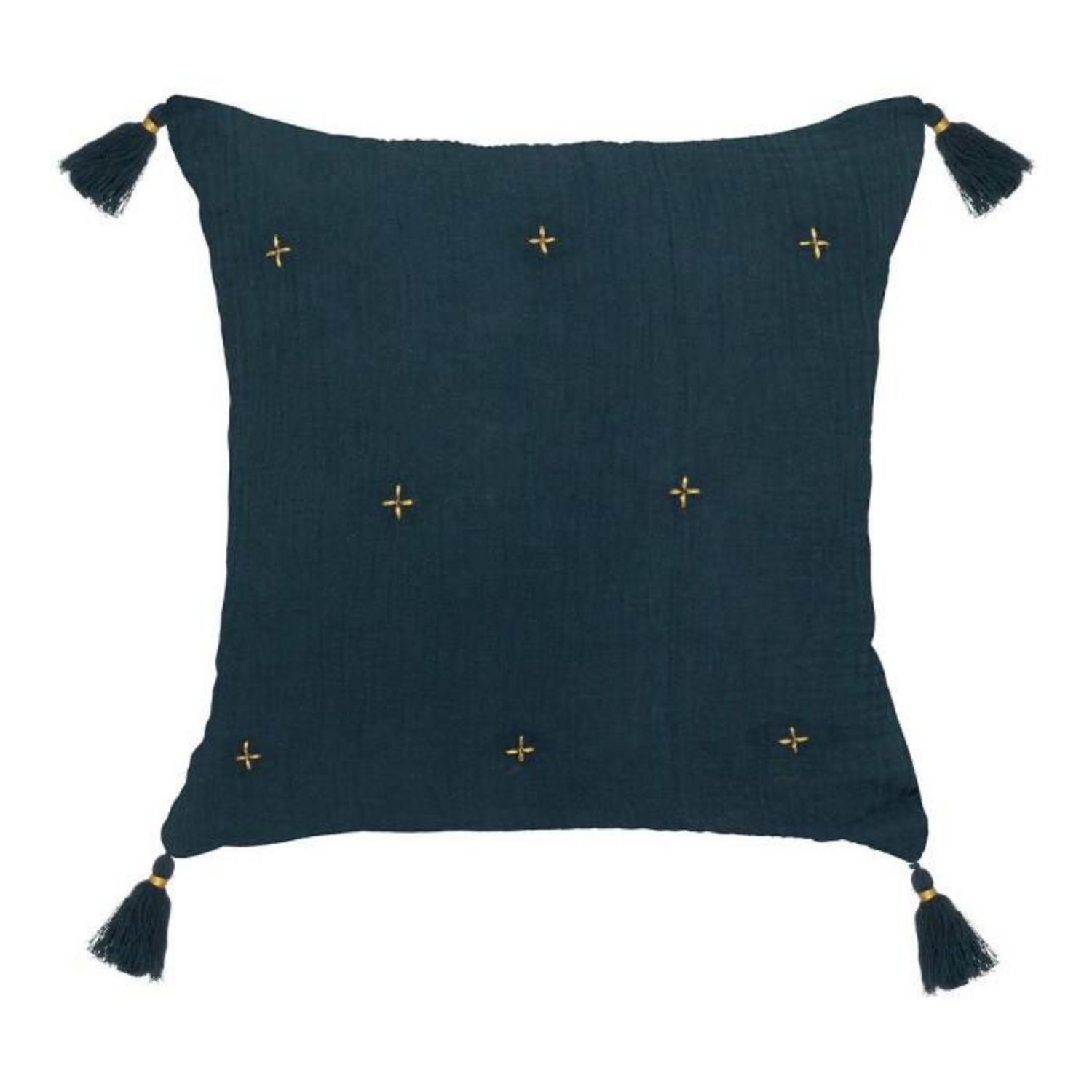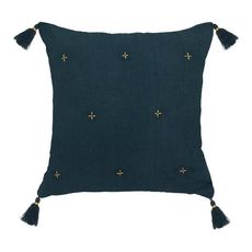 Informations Techniques : Dimensions : L. 40 x l. 40 x H. 10 cm Matières : Housse : Coton Rembourrage : Polyester Fermoir : Polypropylène Spécificités : Pratique & Utile Coussin déco déhoussable 4 pompons Borderie dorée Forme carrée Poids : 0,36 kg Couleur : Bleu Pétrole