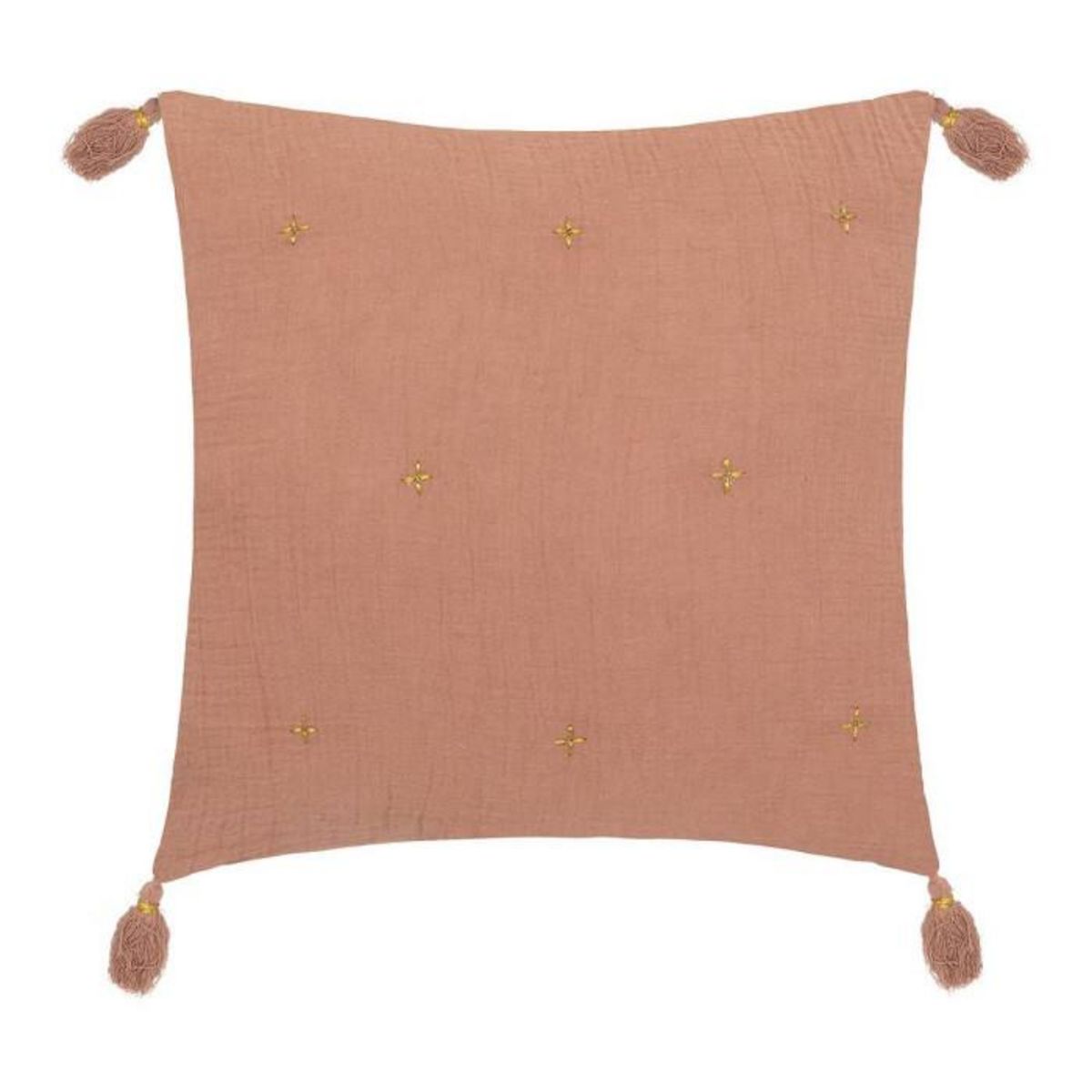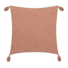 Informations Techniques : Dimensions : L. 40 x l. 40 x H.10 cm Matières : Housse : Coton Rembourrage : Polyester Fermoir : Polypropylène Spécificités : Pratique & Utile Coussin déco déhoussable 4 pompons Borderie dorée Forme carrée Poids : 0,36 kg Couleur : Rose Antique