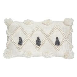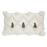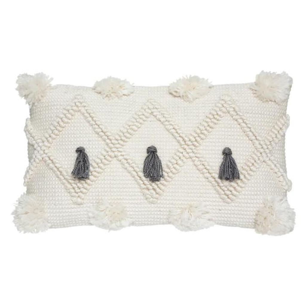 Informations Techniques : Dimensions : L. 50 x l. 12 x H. 30 cm Matière : Polyester Spécificités : Design & Pratique Coussin déco Forme Rectangulaire A Motifs Déhoussable Type de Finitions : 3 Pompons & Zip Poids : 0,653 kg Couleur : Gris