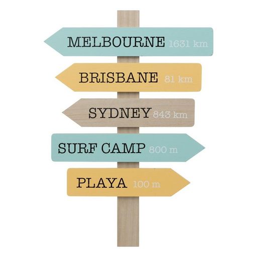 En savoir +Pour une déco au top, ornez votre mur avec cette enseigne flèches de directions Australie multicolore. Ambiance road-trip en Australie garantie !Informations sur la déco murale Australie :Couleur : multicoloreComposition : MDFDimensions : L. 38 x P. 1,6 x H. 54 cmPoids : 600 g