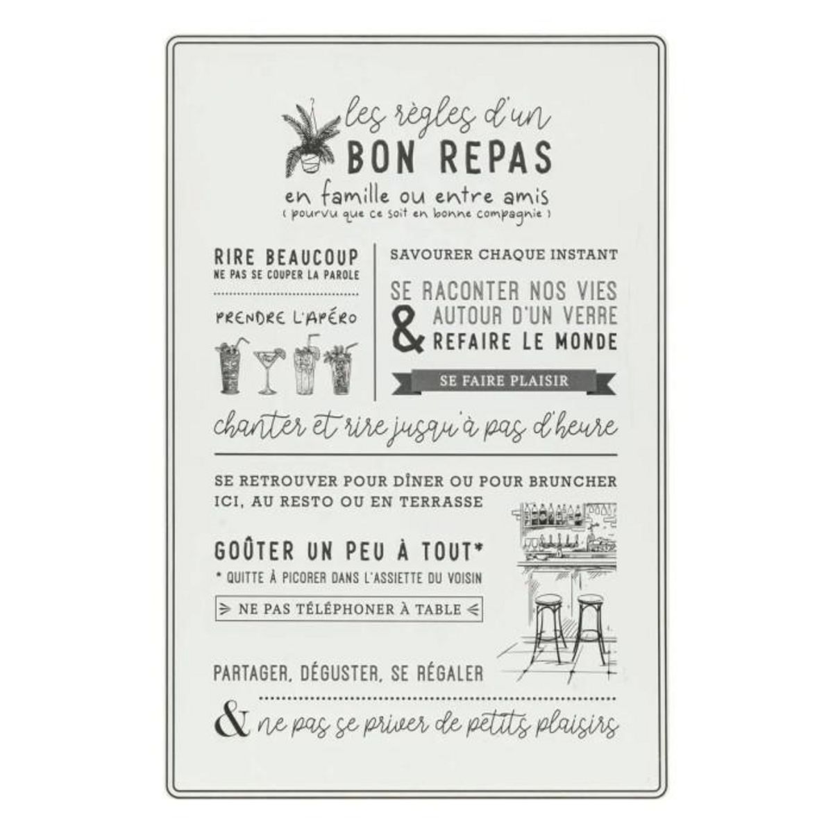 Informations Techniques : Dimensions : L. 38,7 x l. 0,7 x H. 58,5 cm Matière : Fer Spécificités : Tendance & Déco Décoration Murale Forme Rectangulaire Avec Inscriptions A Suspendre Poids : 1,08 kg Couleur : Blanc & Noir