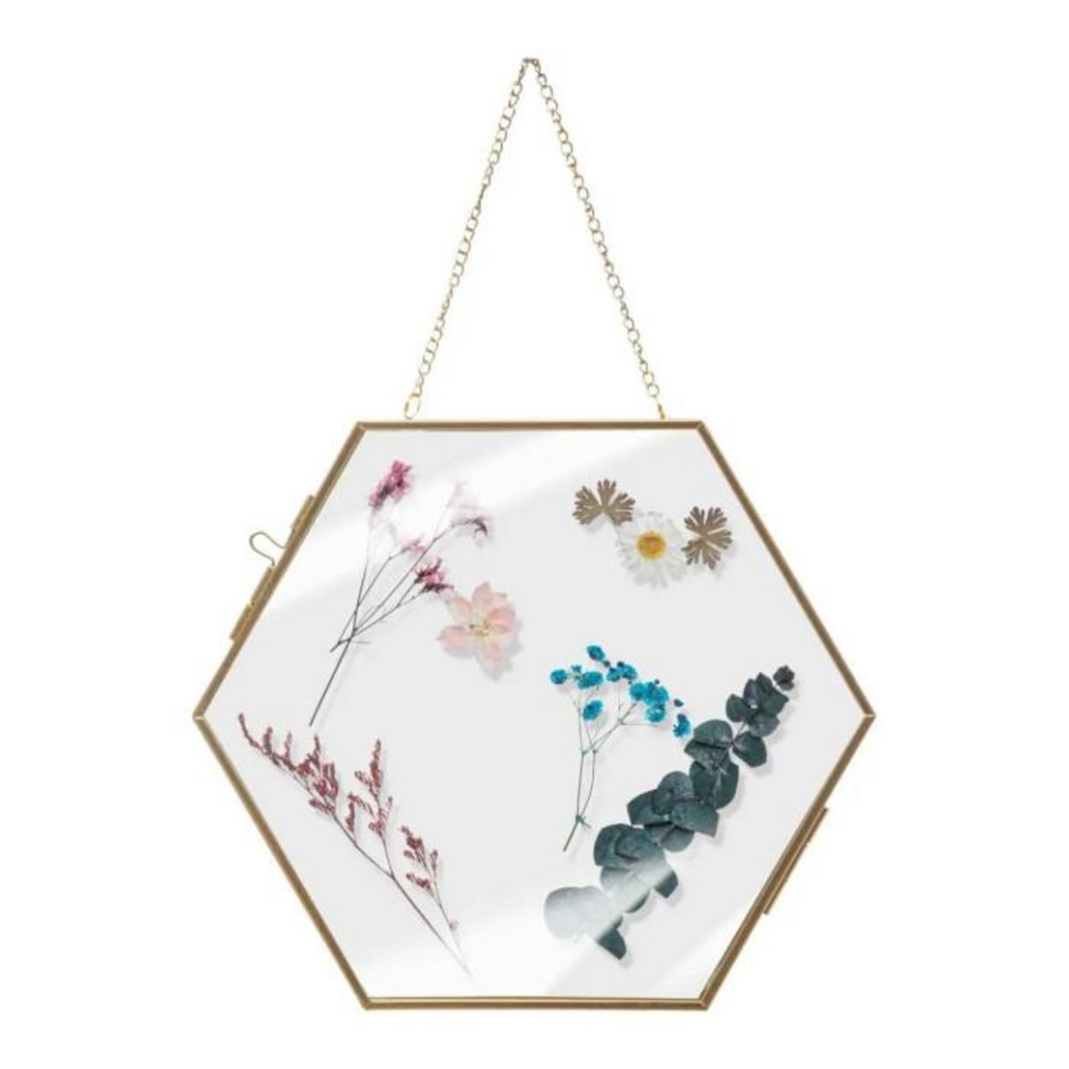 Informations Techniques : Dimensions : L. 21,8 x l. 1 x H. 25 cm Matières : Métal, Verre & Plantes séchées Spécificités : Déco & Chic Composition de fleurs séchées À suspendre avec chaînette Forme hexagonale Poids : 0,56 kg Couleur : Or