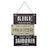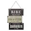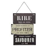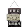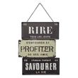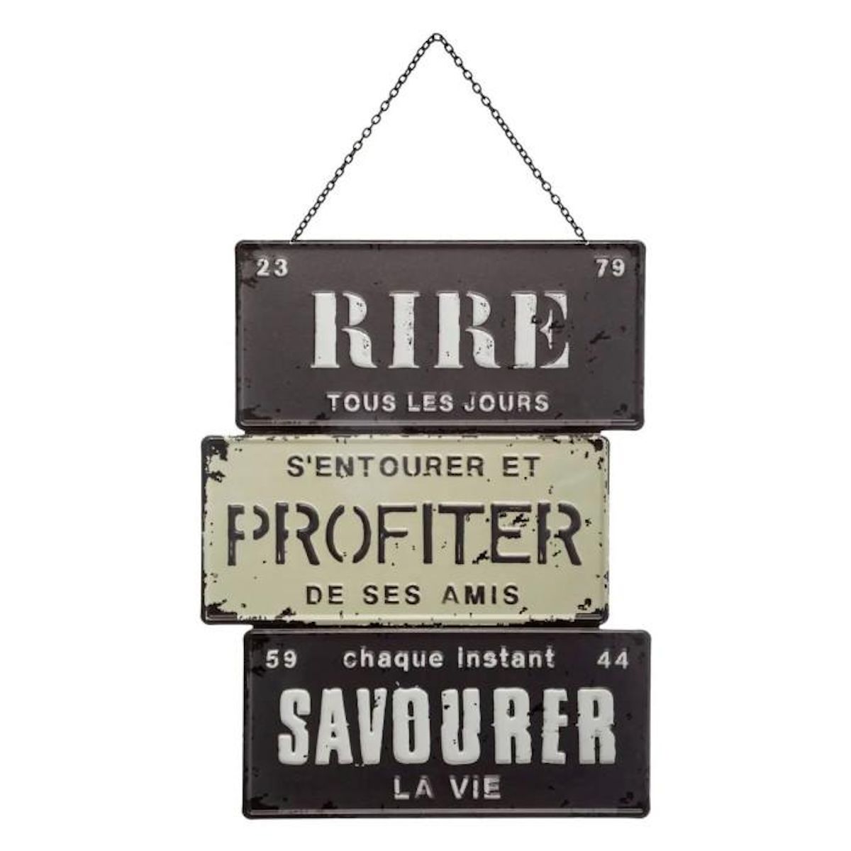 Informations Techniques : Dimensions : L. 26 x l. 0,2 x H. 34,5 cm Anse : L. 11,8 cm Matière : Fer Spécificités : Rétro & Vintage Décoration Murale Forme Rectangulaire Design à Message Fixation avec chaîne Facile d'entretien & d'utilisation Poids : 0,34 kg Couleur : Noir & Blanc
