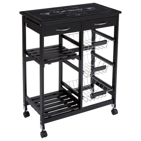 Organisez votre cuisine avec cette desserte noire à roulette pratique et tendance.FICHE TECHNIQUE- Desserte en verre, MDF, Bois de pin, métal et PVC.- Pratique grâce à ses nombreux rangements.- Desserte avec roulettes pour faciliter son transport.- Inscription sur le plateau.CARACTERISTIQUES TECHNIQ