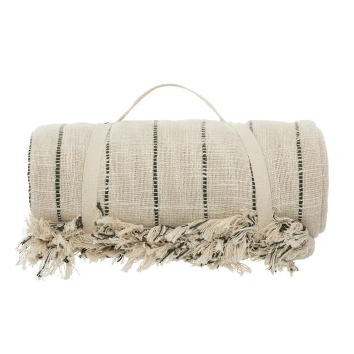 Informations Techniques : Dimensions : L. 260 x l. 240 x H. 1 cm Matière : Coton Spécificités : Pratique & Utile Dessus de lit à franges Motif avec rayures Convient pour un lit king / queen size Poids : 2,25 kg Couleur : Beige