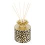 Informations Techniques : Dimensions : D. 12 x H. 26 cm Matières : Huile Parfumée & Verre Spécificités : Chic & Déco Diffuseur de parfum rond Avec 8 bâtonnets Design imprimé léopard Types de fragrances : Boisée & Fruitée Senteur : Jardin Tropical Contenance : 450 ml Durée de diffusion : +