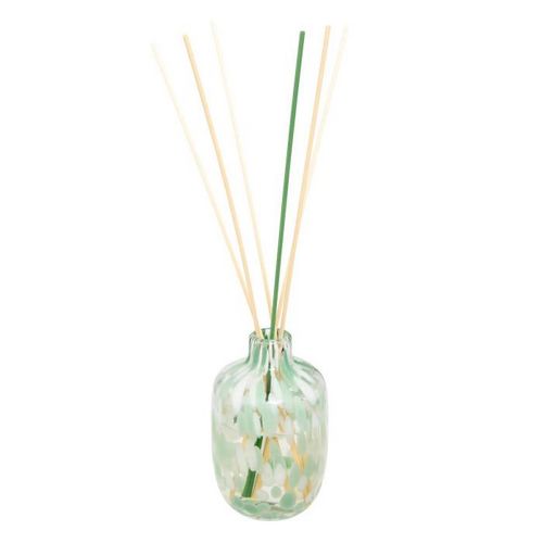 Informations Techniques : Dimensions : D. 11,5 x H. 47,5 cm Matières : Verre & Huile parfumée Spécificités : Déco & Élégant Diffuseur de parfum design Avec 6 bâtonnets Imprimé tacheté Senteur : Fleur de lin Capacité : 850 ml Durée de diffusion : 30 semaines Poids : 1,47 kg Couleur : Vert