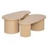 Le duo de tables basses gigognes Soleya présente un design contemporain et sculptural. Les plateaux ont une forme organique, avec des courbes douces, évoquant des galets, et sont réalisés en bois clair, apportant une touche naturelle et chaleureuse à l'ensemble. Chaque table repose sur une base dist