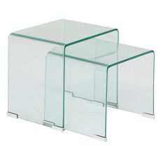 Aussi esthétiques que pratiques, les 2 tables gigognes Lenia conviendront aux petits espaces grâce à leurs dimensions, la plus petite s'emboîtant complétement dans la plus grande pour un véritable gain de place. Dans un esprit contemporain, elles sont composées de plateaux en forme de U inversé, entièrement réalisés en verre trempé. Un jeu de transparence élégant, ponctué par des pieds chromés. Vous pourrez les placer sur un tapis confortable et les entourer d'un ou deux poufs pour former un ensemble convivial.