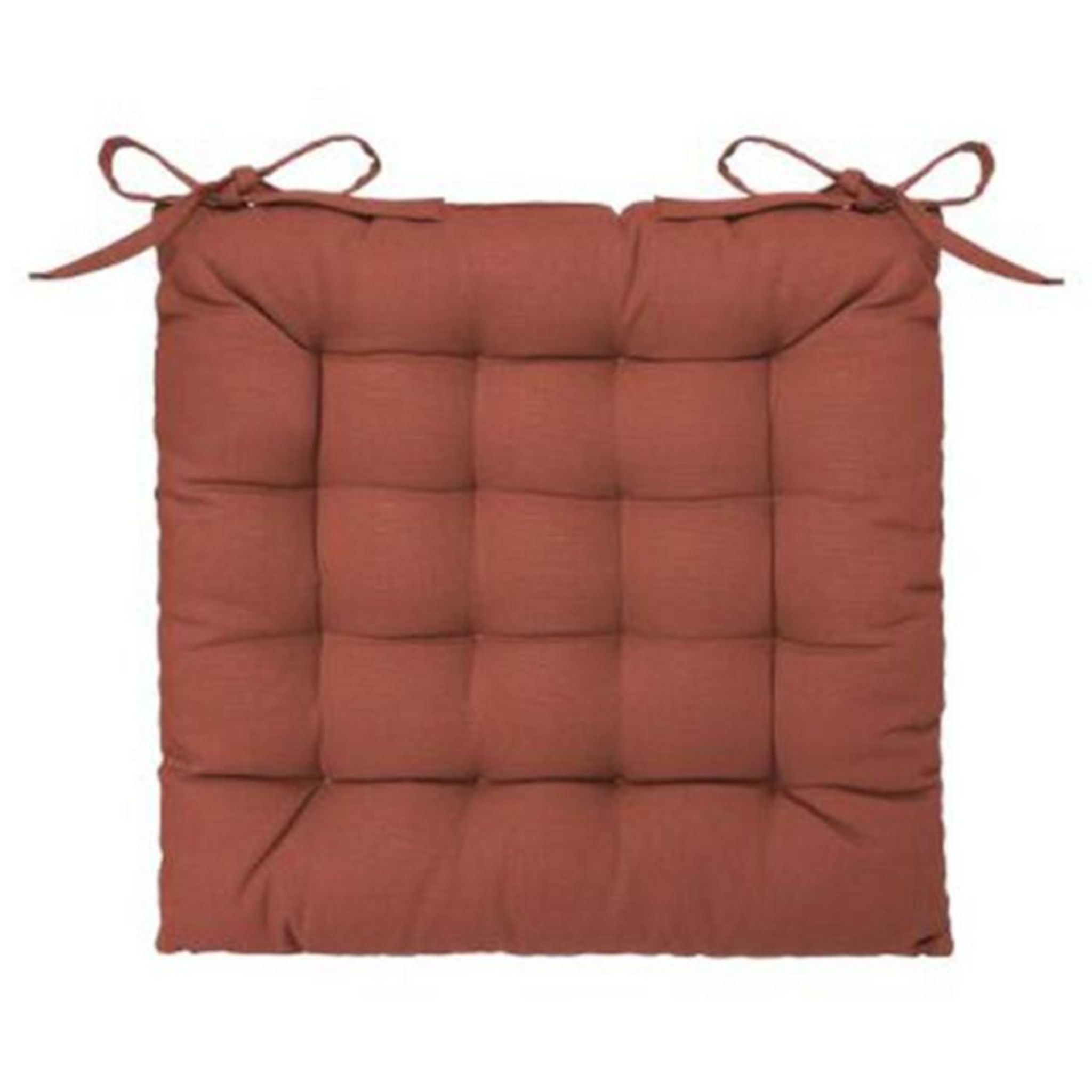 Informations Techniques : Dimensions : L. 38 x l. 38 cm Matière : 100% Coton Spécificités : Confortable & Pratique Galette de chaise Avec liens à nouer Forme carrée Poids : 0,3 kg Couleur : Terracotta