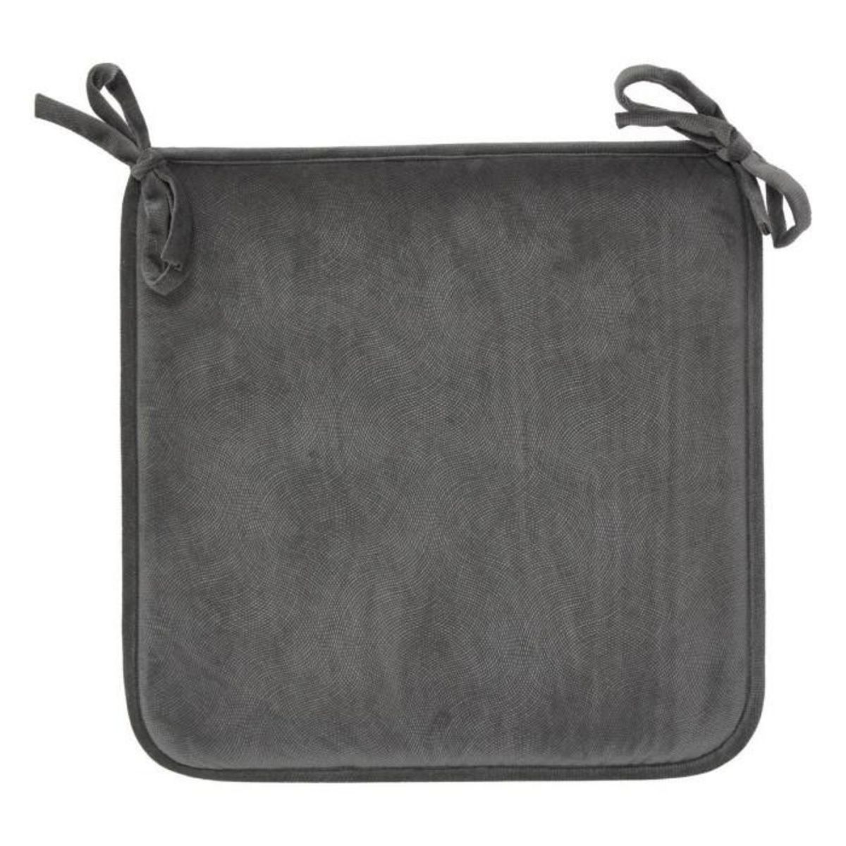 Informations Techniques : Dimensions : L. 38 x l. 38 x H. 3 cm Matière : 100% Polyester (200g/m²) Spécificités : Pratique & Confort Coussin de chaise uni Avec 2 nouettes Certifié OEKO-TEX Poids : 0,18 kg Couleur : Gris Foncé