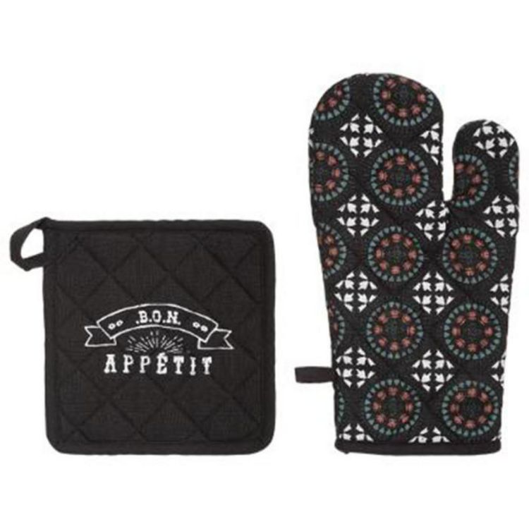 Informations Techniques : Dimensions : Gant : L. 32 x l. 18 x H. 3 cm Manique : L. 20,2 x l. 20,2 cm Matière : Coton Spécificités : Pratique & Déco Gant & Manique Motifs imprimés Facile d'utilisation et d'entretien Couleur : Gris