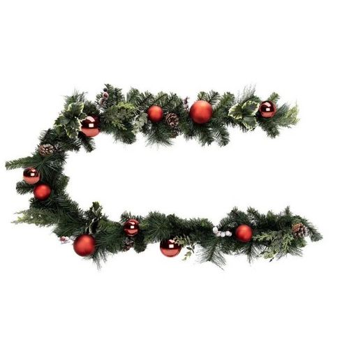 Informations Techniques : Dimensions : L. 20 x l. 20 x H. 200 cm Matières : PVC & Polyéthylène Spécificités : Pratique & Utile Guirlande de Noël Nombre de Brins : 120 Avec Feuilles de Houx, Pommes de Pin, Baies & Boules de Noël Avec Paillettes Poids : 0,847 kg Couleur : Vert & Rouge