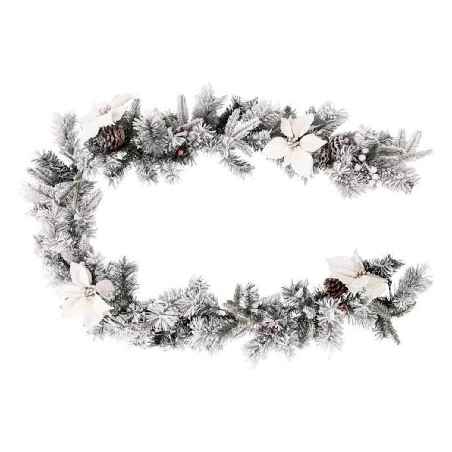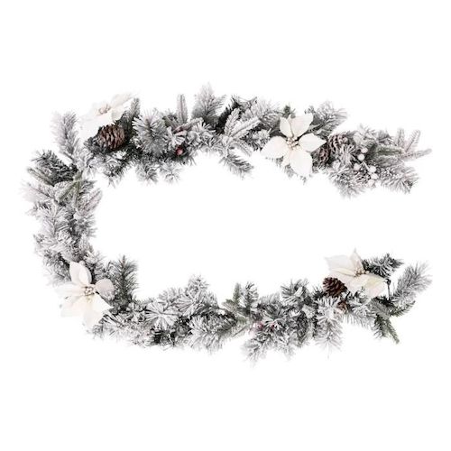 Informations Techniques : Dimensions : L. 20 x l. 20 x H. 200 cm Matière : PVC Spécificités : Pratique & Utile Guirlande de Noël 160 Brins Dépliage Branche : Manuel Contient : 4 Sets de Fleurs 8 Pommes de Pin 4 Sets de Baies Poids : 0,88 kg Couleur : Blanc & Vert