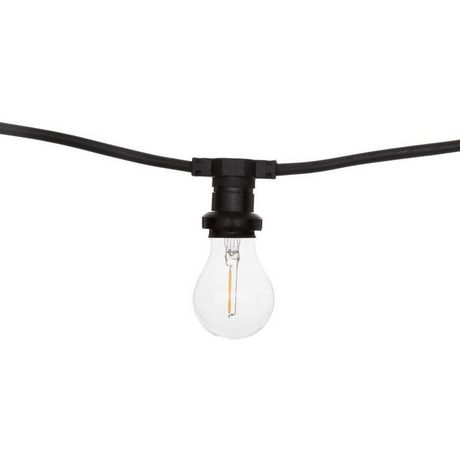 Informations Techniques : Dimensions : L. 520 x l. 4,7 x H. 6 cm Câble : L. 500 cm Matières : Verre SBR Spécificités : Lumineuse & Utile Guirlande extérieur 10 ampoules incluses Ave prise secteur Éclairage : Blanc Chaud Poids : 0,95 kg Couleur : Noir