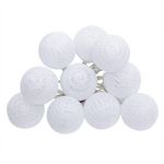 Votre pièce manque de chaleur ? Cette guirlande lumineuse sera votre atout charme.FICHE TECHNIQUE- Guirlande LED.- Couleur des boules : Blanc.- Détails : 10 boules.- Matière : Coton, Cuivre et Polystyrène.- Fonctionne à pile (3 x AA / LR6).- Piles non incluses.- Alimentation batterie.- Couleur LED :