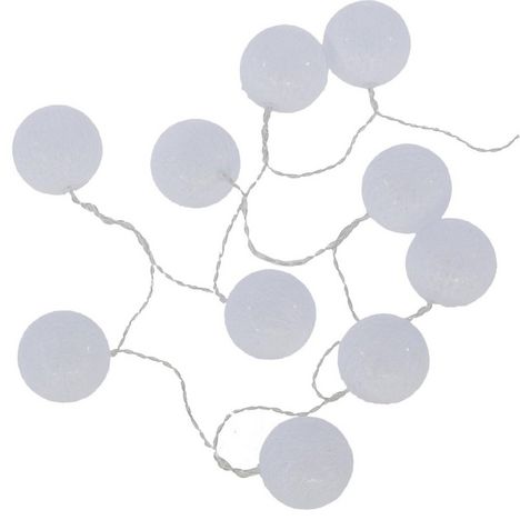 Guirlande lumineuse Blanche 10 boules LED à pilesLa guirlande 10 boules est composée de 10 LED disposées dans des boules de 6cm de couleur blanche afin de créer une atmosphère particulière et rendre votre décoration unique.Cette guirlande peut tout aussi bien être suspendue horizontalement comme ver
