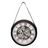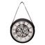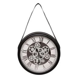 Informations Techniques : Dimensions : L. 40 x l. 7 x H. 63,5 cm Diamètre : D. 40 cm Anse : H. 23 ,5 cm Matières : Polypropylène & Verre Spécificités : Pratique & Rétro Horloge murale ronde Avec lanière de suspension Design mécanique Chiffres romains Mouvement continu Mécanisme mobile Piles non incl