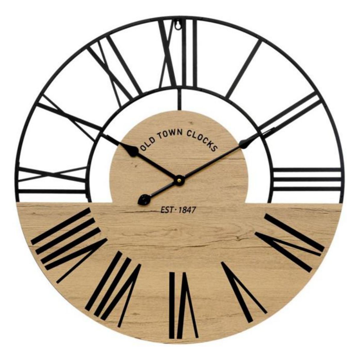 Informations Techniques : Dimensions : D. 70 x H. 4,5 cm Matières : Métal & MDF Spécificités : Pratique & Utile Horloge murale design Semi-ajouré Chiffres romains Style néo industriel Forme ronde Fonctionne avec 1 pile (non incluse) Type de pile : LR6 - AA - 1,5V Poids : 1,98 kg Couleur : Noir & Nat