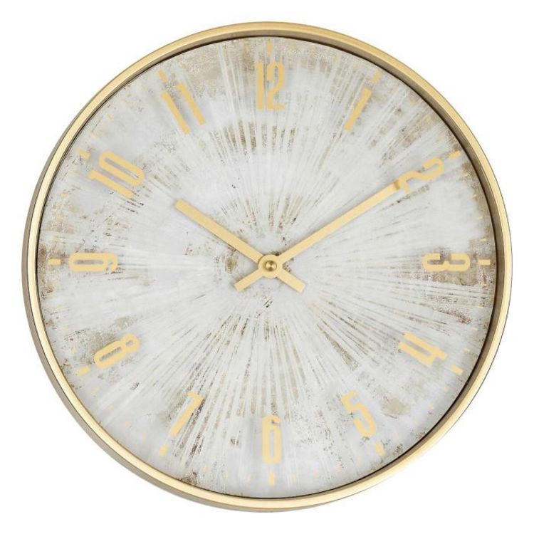 Informations Techniques : Dimensions : D. 30 x l. 4 cm Matières : ABS & Verre Spécificités : Chic & Utile Horloge murale ronde Fond papier texturé Chiffres analogiques Mécanisme silencieux Mouvement continu Pile non incluse Type de pile : 1 x LR6 - AA - 1,5 V Poids : 0,55 kg Couleur : Doré