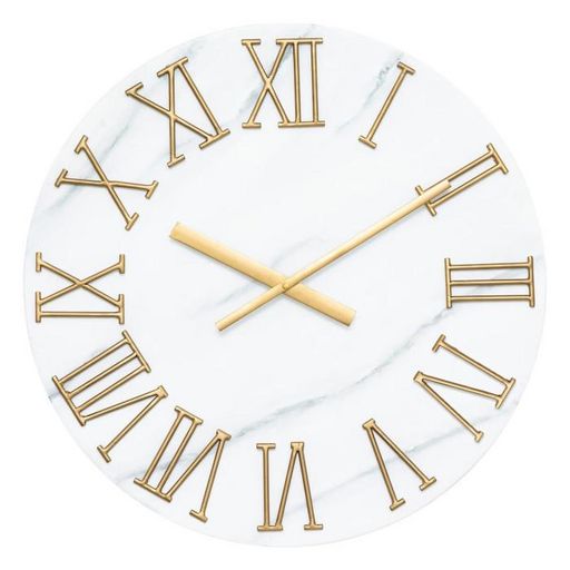 Informations Techniques : Dimensions : L. 56 x l. 6 x H. 56 cm Matière : Acier Spécificités : Chic & Moderne Horloge murale ronde Imprimé marbre Chiffres romains Mouvement saccadé Mécanisme silencieux Pile non incluse Type de pile : 1 x LR6 - AA - 1,5V Poids : 2,8 kg Couleur : Gris Clair & Doré