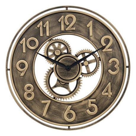 Informations Techniques : Dimensions : D. 48 x l. 4 cm Matière : Métal Spécificités : Élégante & Vintage Horloge murale ronde Design mécanisme Chiffres analogiques Mouvement saccadé Mécanisme silencieux Pile non incluse Type de piles : 1 x LR6 - AA - 1,5V Poids : 1,2 kg Couleur : Or
