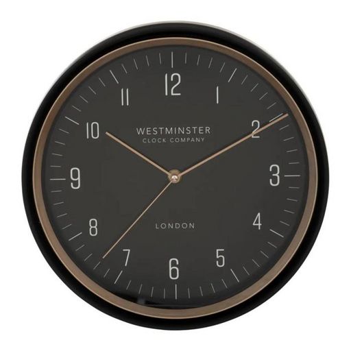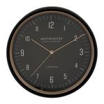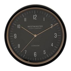 Informations Techniques : Dimensions : D. 29,3 x H. 5 cm Matières : Polypropylène & Verre Spécificités : Pratique & Utile Horloge murale Inscription Westminster clock company - London Forme ronde Fonctionne avec 1 pile (non incluse) Type de pile : LR6 - AA - 1,5V Poids : 0,53 kg Couleur : Noir
