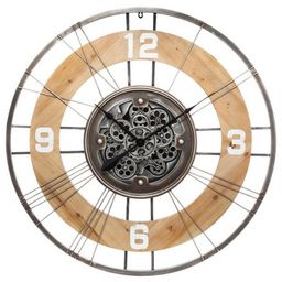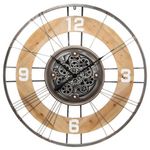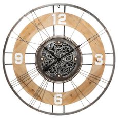 Informations Techniques : Dimensions : D. 90 cm Épaisseur : 7 cm Matières : Fer, Bois (Sapin) & ABS Spécificités : Pratique & Utile Horloge Murale Forme Ronde A Suspendre Style Vintage & Rétro Marque Mouvement : Jibang 8838 Marque Rouage : Jibang V99 Mouvement Silencieux Fonctionnement à Piles (3 x